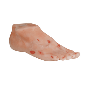 Realistic replica of an adult foot showing different stages of diabetic ulcers. Ideal for demonstrating the importance of foot care for diabetics. The special material not only provides a realistic appearance, but is also suitable for gluing plasters and vacuum dressings.