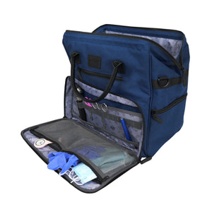 The large interior main space includes 6 pockets, 2 removable Velcro dividers, 1 padded compartment for the laptop. With a very large two-way zip opening, it provides very easy access to diagnostic instruments and care equipment