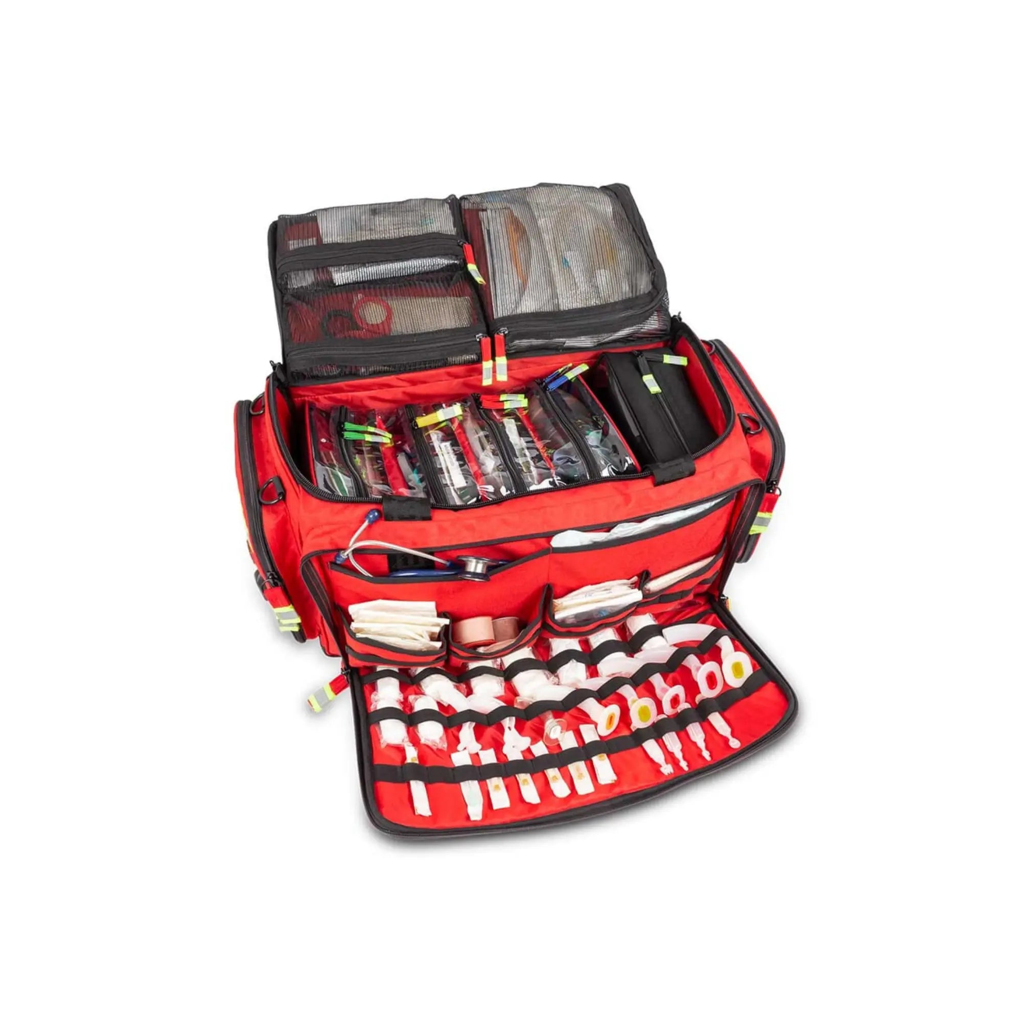 • 2 grandes bolsillos exteriores con pequeños bolsillos transparentes, bandas elásticas y espacio para guardar el collarín cervical