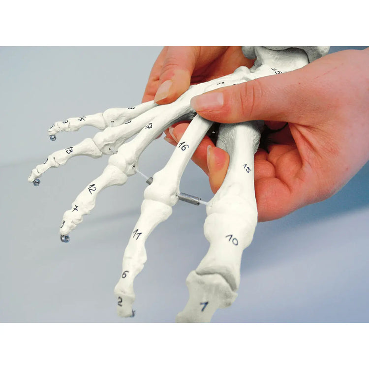 Réplica natural del pie humano con la parte más baja de la tibia y el peroné. El pie está instalado sobre la goma, de modo que el movimiento de rodadura del pie se puede demostrar perfectamente. Para fines de capacitación y explicación cuando esté con un cliente. Todos los huesos están numerados (se incluye ficha técnica con terminología).