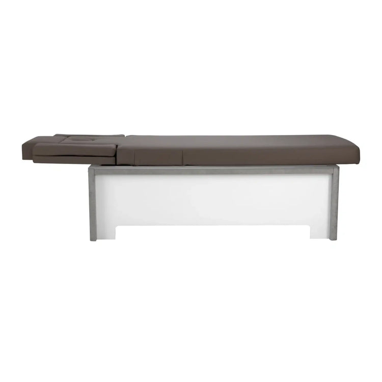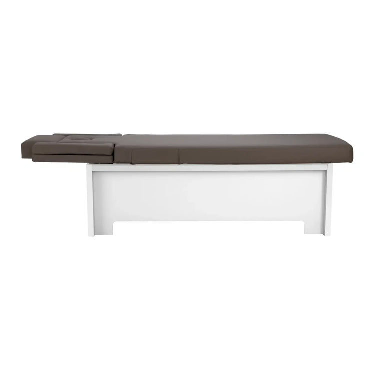 La camilla de tratamiento está disponible en colores de tapizado blanco y moka así como en tres acabados de madera: nogal natural, nogal terracota y tipo hormigón.