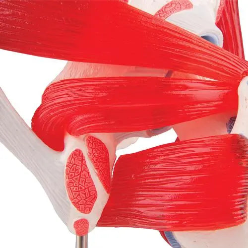 Ce modèle illustre l'articulation coxofémorale droite chez un homme ; divers muscles y sont visibles ainsi que les zones d'insertion musculaire distale et proximale du fémur et de l'os iliaque. A des fins didactiques, les surfaces musculaires des zones distales et proximales sont mises en surélévation et colorées différemment (insertion distale = rouge ; insertion proximale = bleu). Les divers muscles de la hanche sont disposés sur les surfaces respectives de leurs insertions distales et proximales, ce qui permettra de les retirer.