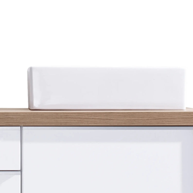 Vasque en céramique carrée. Design parfaitement adapté aux lignes du meuble.